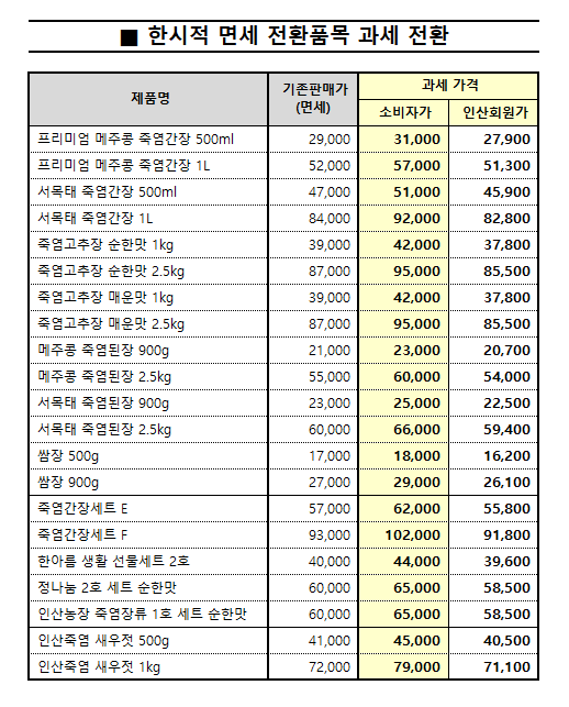제목 죽염고추장 된장 간장 면세 -> 과세전환 가격인상